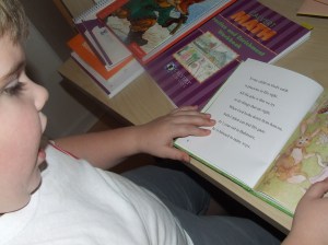 The pictures above show another part of Seth’ s Math lesson. For this activity Seth read a story book to me out loud, then we talked about the story: what happened first, next, and last. We noticed the order of the page numbers, and talked about before and after. This book is very special to us because it was a gift from our dear friends Ben and Miranda. Seth was the ring bearer in their wedding in 2004. Their gift to him was a personalized book about God’s Gifts to Seth. Since it had been awhile since we enjoyed the book I thought it would make a nice addition to the lesson. Also the book has over 30 pages so it’s great for reading.