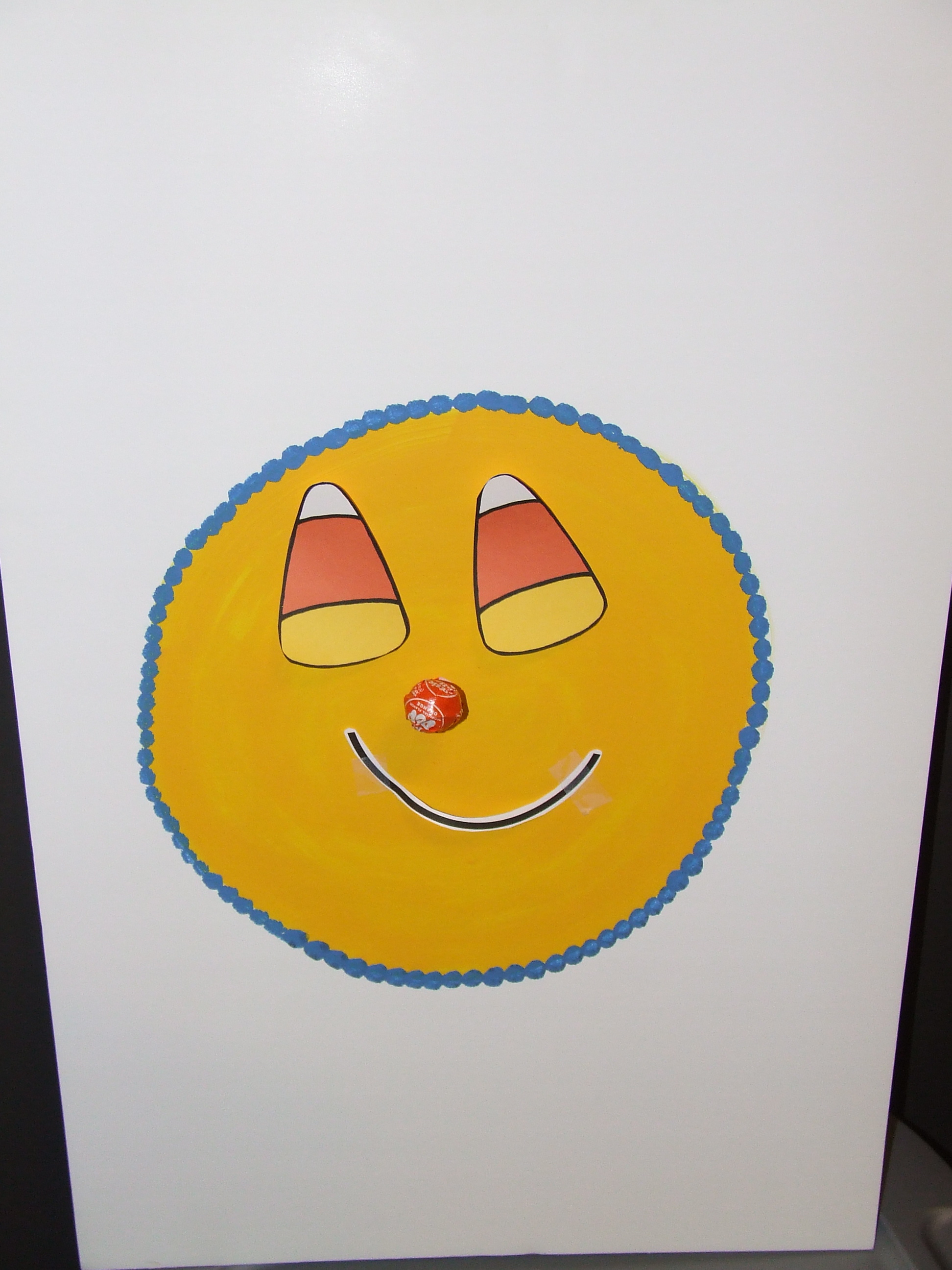 The little boy was decorating a cake for his Grandma, he used Candy Corn for the eyes, a Tootsie Pop for the nose, and Licorice for the smile.