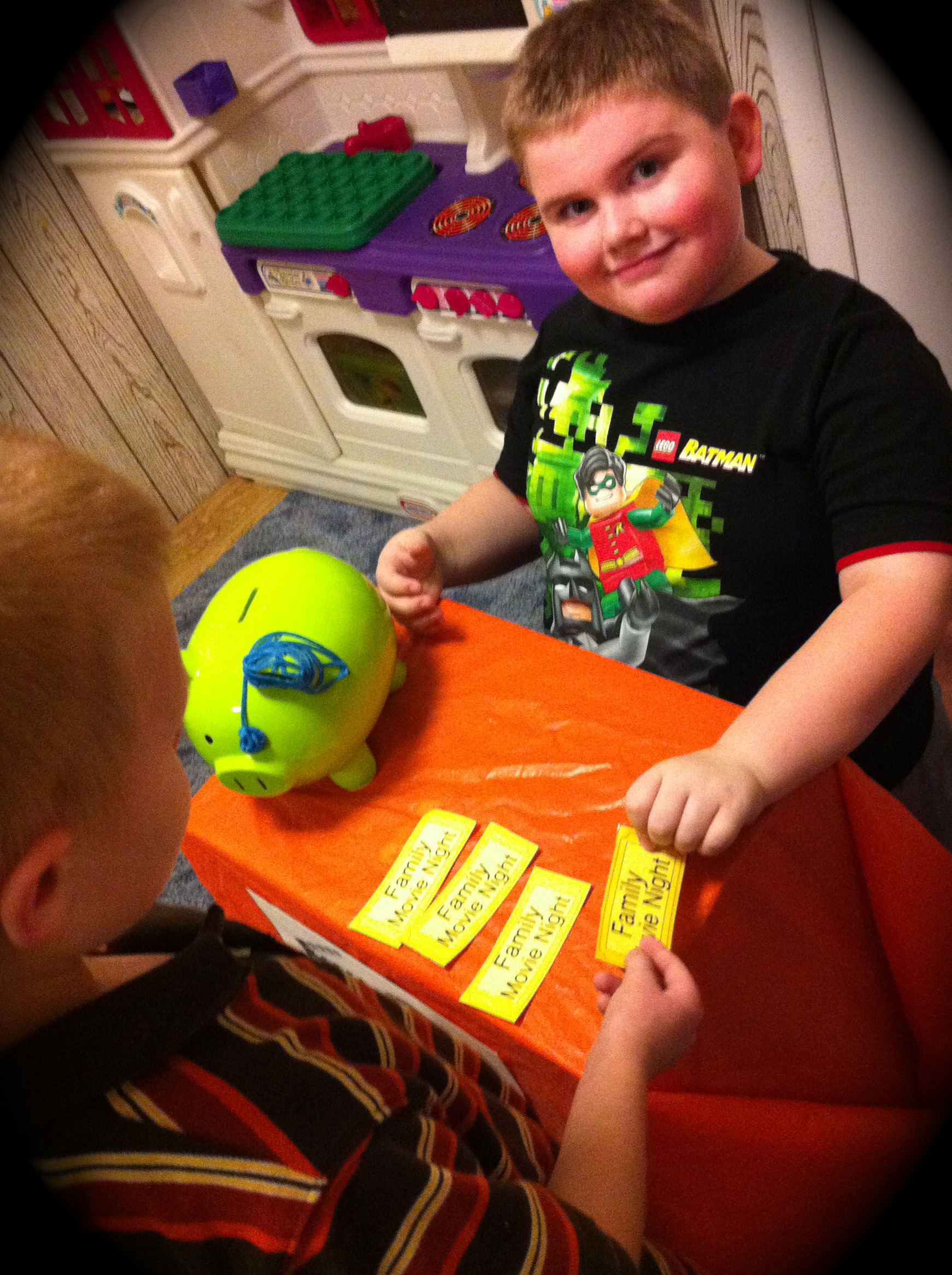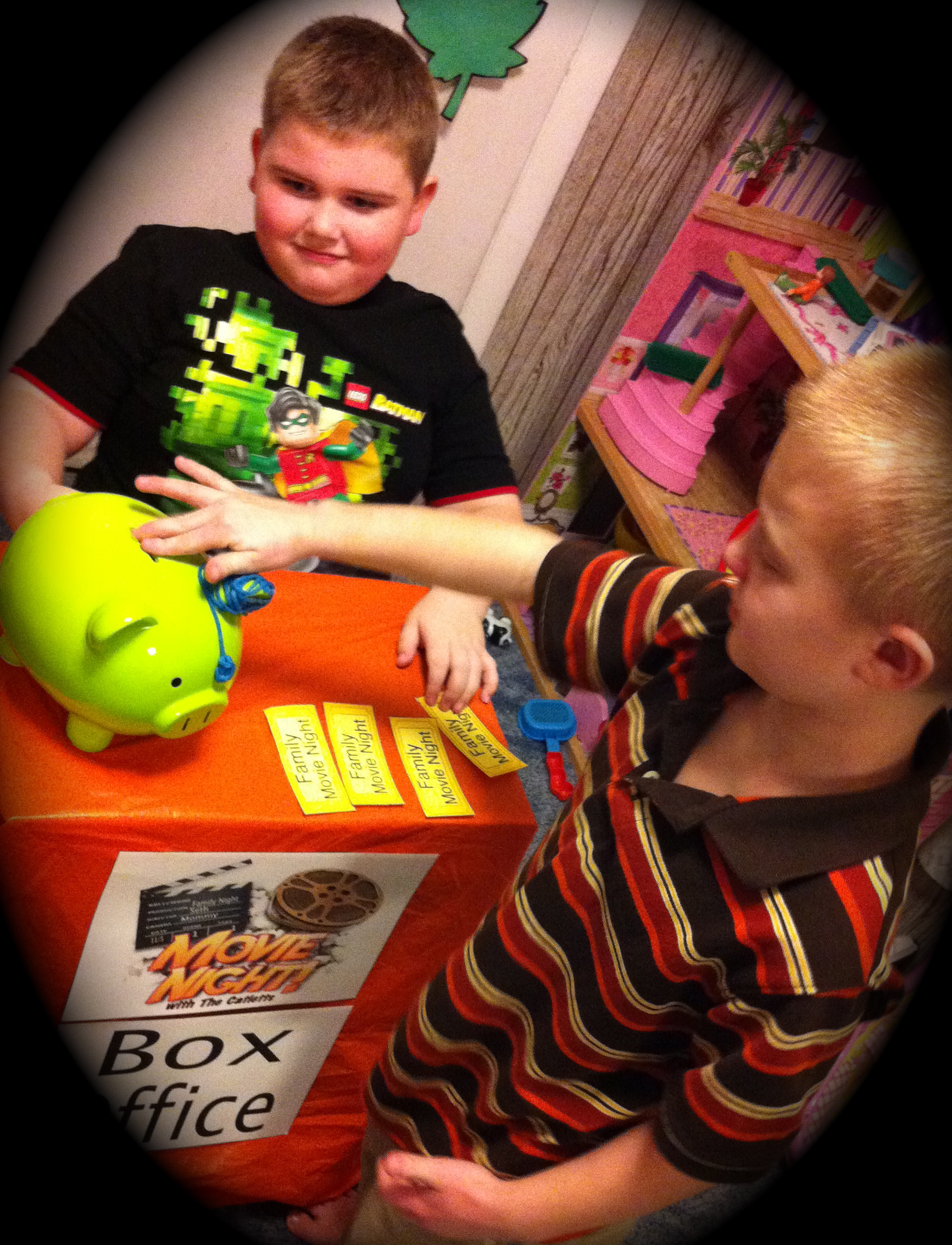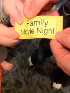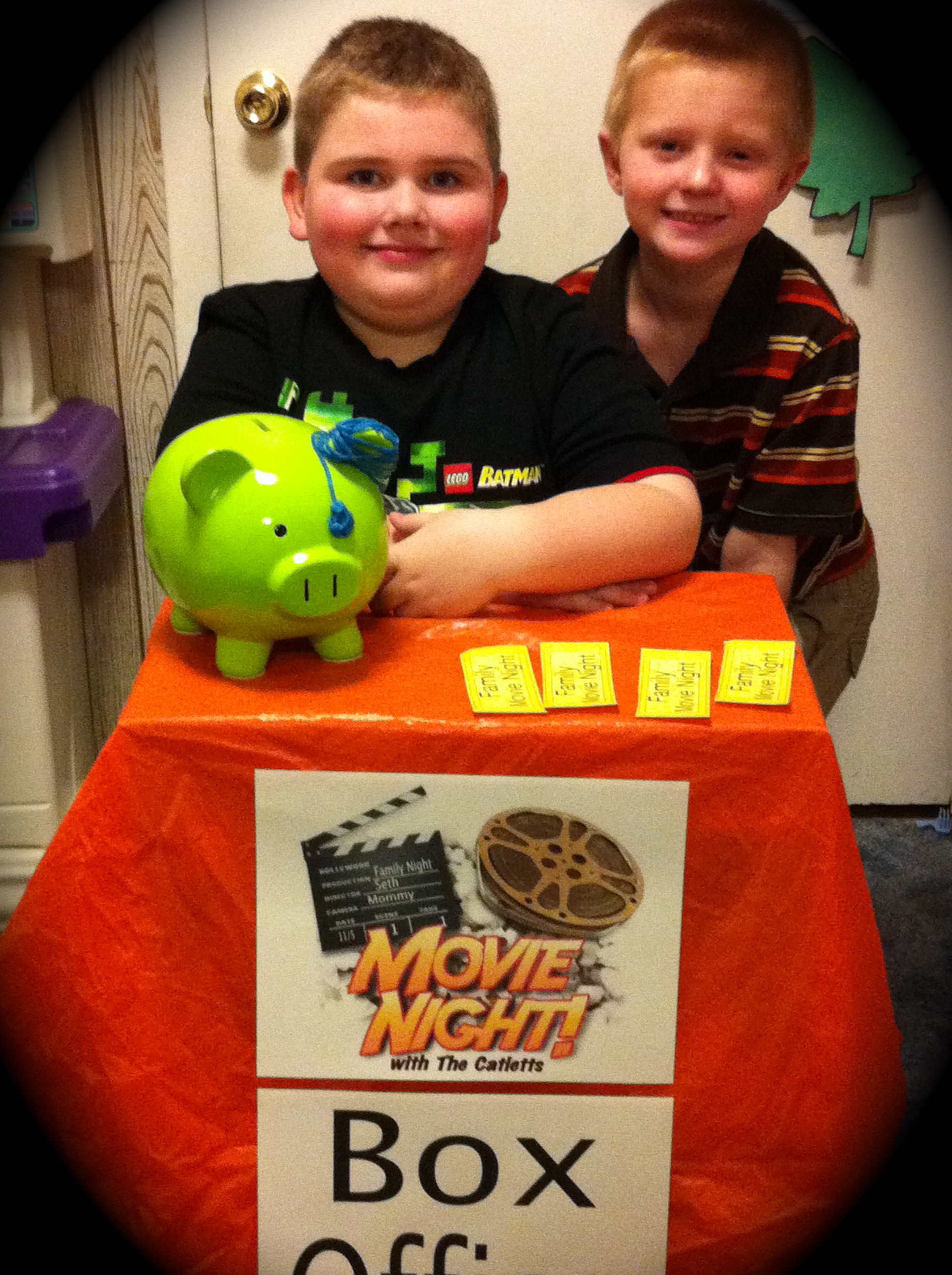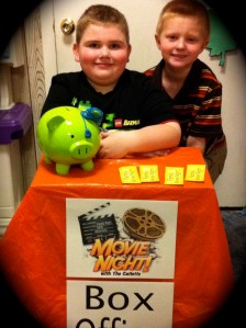 I printed signs that said Box Office and Concession Stand, then placed them in their areas so we could visit each station just like at the real theater. For the tickets, I found a clip art design online, then used Print Shop to change the words on the ticket to Family Movie Night. Everyone thought is was cool that they had to purchase their own ticket to get into the movie. I supplied the quarters for the cost of the ticket.