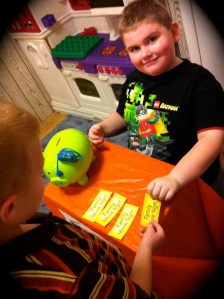 Tickets were sold at the Box Office, Seth and Tommy took turns. We each presented a quarter to the ticket booth worker and then it was placed in the rockin green piggy bank you see here. Seth designed the piggy bank with bendaroo’s awhile ago, and was thrilled to be able to add to his piggy bank on this evening.