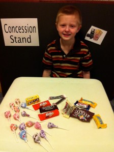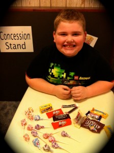Next we visited the Concession Stand. We did not have to purchase the snacks, we just chose what we wanted, the Concession Stand snacks were included with the price of the movie ticket. Tommy was so excited to choose his candy he kept picking out what he wanted in advance, it was adorable. Seth is not real big on candy, but he enjoyed shopping for candy, and picked out a few things to bring into the theater.