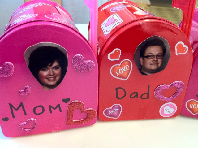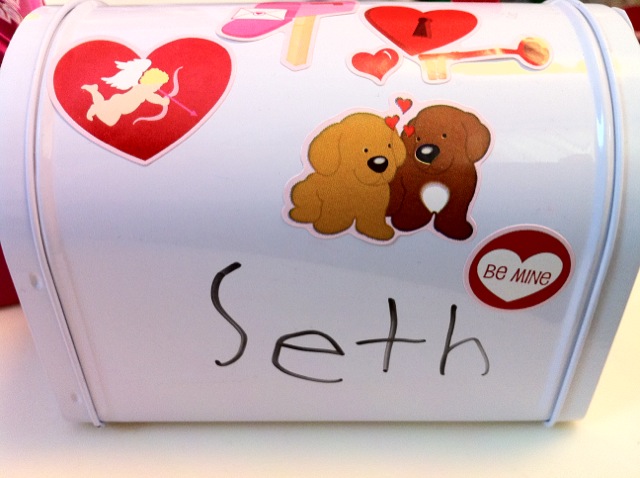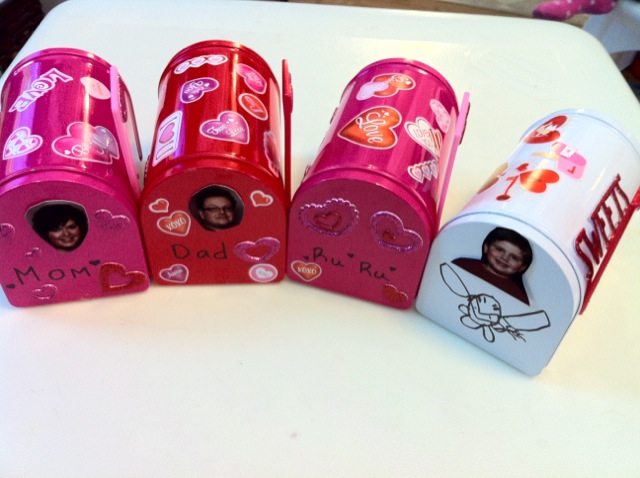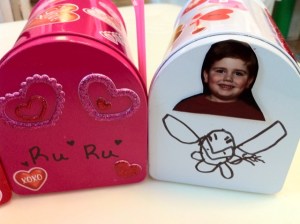 I went to Target (just as Holly suggested in her blog) and purchased the mailboxes for a $1.00 each. We had some Valentine stickers in our craft kit from earlier purchases at Target, Michael’s and The Dollar Store. This is what our mailboxes look like: