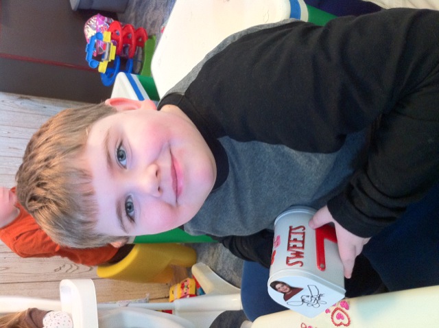 We made Valentine Boxes, and decorated them with stickers and a photo of the mailbox owner. During the day we make the time to write or draw a loving thought or picture to the recipient. Then we raise the flag on the mailbox so that the recipient knows they’ve got mail. We will continue this throughout the month.