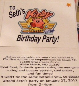 Everything for both of Seth’s Kirby parties were handmade, because we could not purchase Kirby themed party items. Or, we used stars and other general items that helped to enhance the theme of Seth’s Kirby party. I found most of what I needed at The Dollar Store, Michael’s Craft Store, JoAnne Fabrics, A.C. Moore Craft Store, Target, and of course Walmart! I planned and planned for this party, I used a designated folder to hold the contents of the Party Planning ideas, items I needed to purchase and receipts. It was very helpful to take with me when we decorated for Seth’s 8th Birthday Party. I plan to use a Party Planning folder or binder for all other future events, that is how easy it made our lives. Perhaps I’ll blog about the Party Planning Book at a later date. Thank you for reading this blog, I hope this gave you some great ideas if you decide to have a Kirby party too! We had Seth’s party at The Amped Up Amphitheatre (the same location we have our church services – shameless plug). http://www.2ampedup.com or http://www.safehavenchurch.info.
