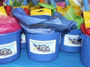 The actual favor buckets for Seth's party. We used a Meta Knight image and placed Seth's face over the face of the Meta Knight for fun. The label reads, Thank you for celebrating with me.