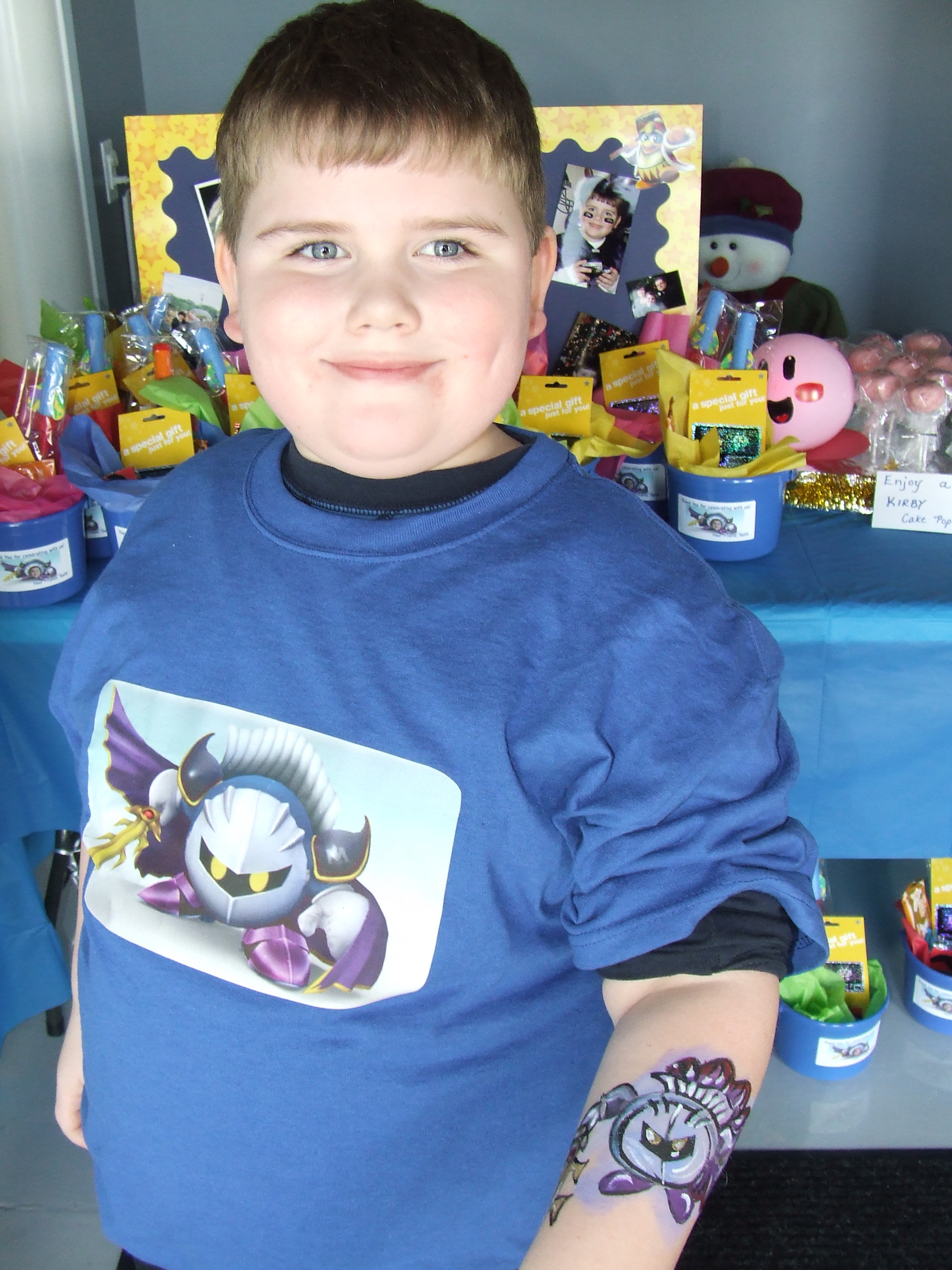 I made Seth's Birthday shirt using an image from Google and Iron On transfers. We hired a face painter, who duplicated Meta Knight (a character from Kirby) beautifully! Check out Seth's arm.